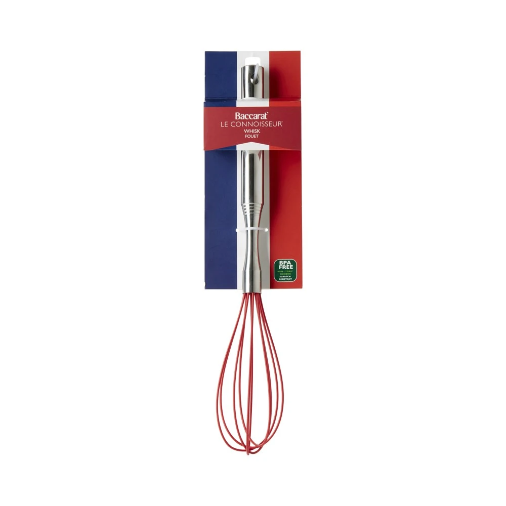French sensibility meets practicality with the Baccarat Le Connoisseur Whisk Red. Excellent for whisking eggs, sauces, batters as well as mixing dry ingredients, the Le Connoisseur Whisk is adept at aerating mixtures for a delightfully fluffy and light consistency. The food grade silicone coating on wires provides an antibacterial layer and gives an easier clean, while the ergonomic handle with embossed logo promotes a strong, sure grip. Baccarat redefines the Le Conoisseur range of utensils with an enduring stainless steel frame that ensures consistent, reliable performance in the kitchen. Add a European twist to your kitchenware collection with a French inspired design, bringing a classic and familiar feel to any space. Enjoy a tricolor inspired red styling embedded in the history of France.