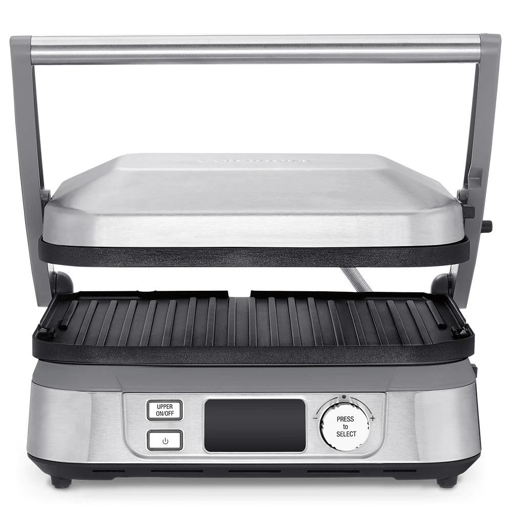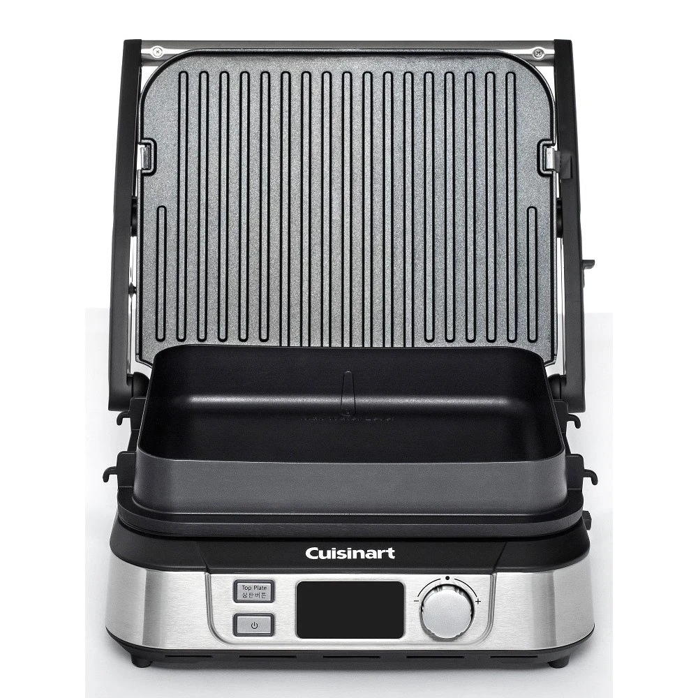 This 5-in-1 grill offers ultimate cooking versatility. Prepare perfectly seared steak, mouth-watering hamburgers, easy stir-fries, golden pancakes, or even bake a cake using the adjustable temperature control. With efficient, removable reversible plates and a deep pan that’s easy to clean, there’s almost nothing you can’t cook. Simply pop out the removable plates and place in the dishwasher. Constructed of high quality brushed stainless-steel housing with non-stick plates ensures you will have equipment to last for years. No matter what’s on the menu today, with Cuisinart’s extensive range of thoughtfully designed cookware, appliances, and accessories, you’ll make every kitchen experience something worth savouring.