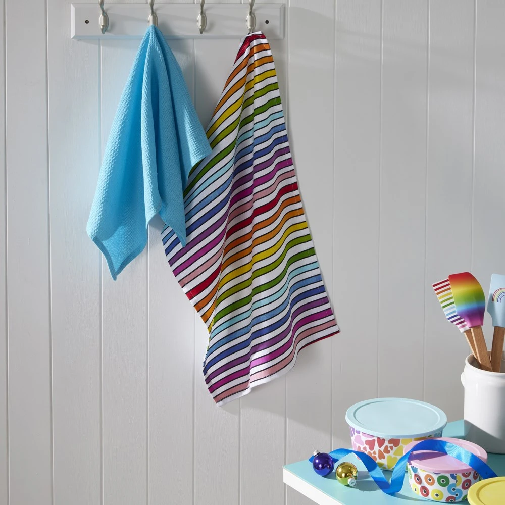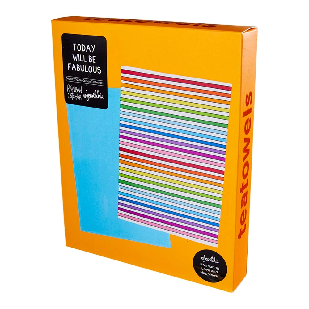 Perfect for anyone who loves the kitchen, the tea towel set arrives boxed making it a great present for any housewarming or birthday. A multi-purpose cooking staple for any kitchen in a fun colourful print of rainbow stripe, the Jewelchic IV White Stripe Tea Towels will tick off function and style at the same time. Made of 100% cotton, including one printed towel and one plain blue towel, the Jewelchic IV Tea Towels are soft to touch and wash beautifully. These tea towels are perfect for handling hot surfaces or drying your freshly cleaned dishes. Complete the look by combining the tea towels with the matching Jewelchic IV White Stripe Oven Gloves and Apron.