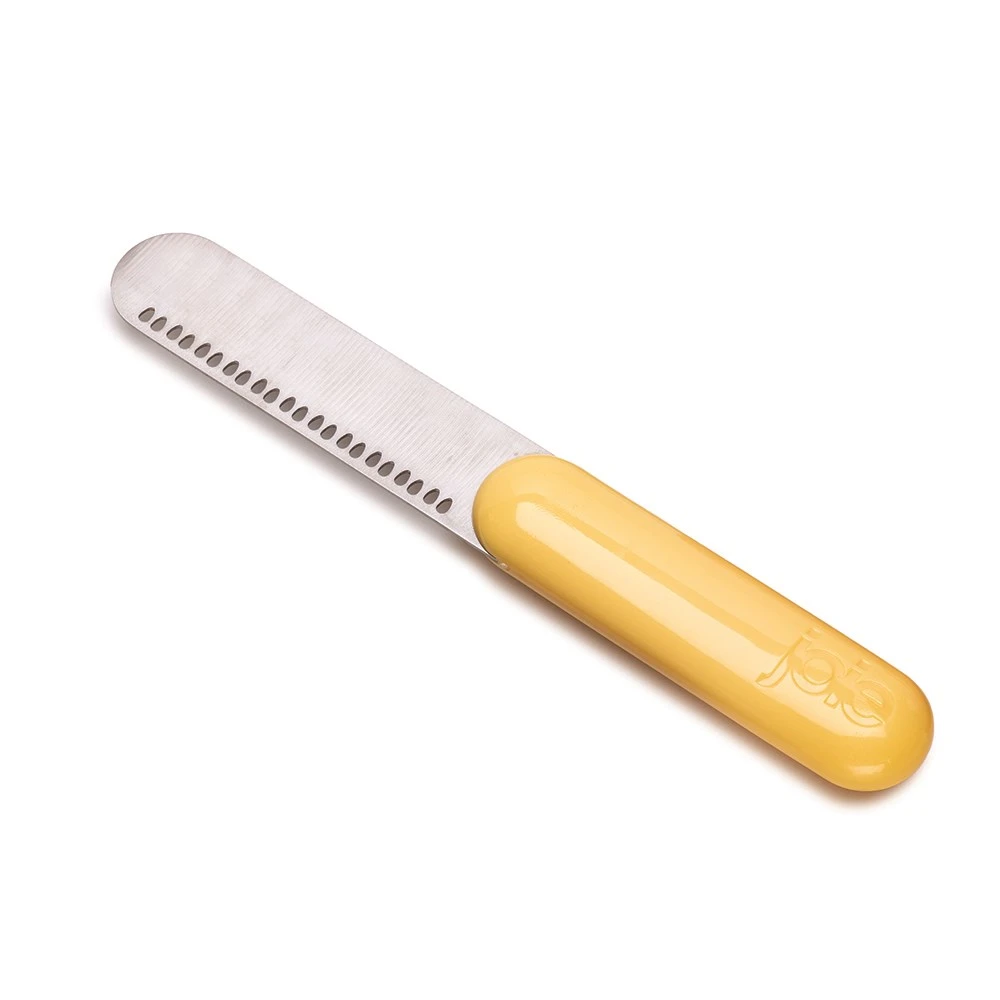 Spread butter like never-before with the handy Joie Butter Knife. Sick of destroying bread attempting to spread rock solid butter over it? The Joie Butter knife spreads butter with ease thanks to its smart design that cuts the butter into soft spreadable strips for you. With a durable stainless steel blade, the Joie Butter Knife features a row of little holes along its edge that creates soft, spreadable strips when you slide it over hard butter. Once the butter is on the knife, simply use the smooth edge to spread it onto whatever you desire, be it crunchy toast, scones, sandwiches and more. The sturdy plastic handle is comfortable to hold and adds a pop of colour to your kitchen. Please note, this item is available in green, red, yellow and black. 1 Colour will be dispatched at random.