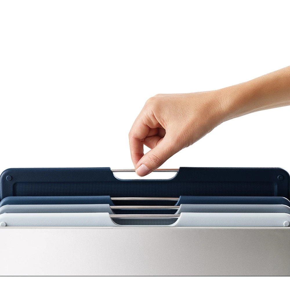 Elevate your at home culinary experience with the Joseph Joseph Folio 4 Piece Chopping Board Set Sky. Comprising of a sleek silver coloured slimline case and four chopping boards, the set will look fantastic placed on the countertop of a host of different style kitchens. With four colour coded chopping boards in calming tones of dusty blue, azure, cumulus grey and white to help avoid cross contamination, each board benefits from a double sided textured cutting surfaces and non-slip feet for safe chopping, slicing and dicing. The innovative case from the Joseph Joseph Folio 4 Piece Chopping Board Set Sky holds the boards separate so the air can circulate around them to avoid bacteria growth and also allows the boards to be effortlessly removed thanks to the smart angled design. The Joseph Joseph Folio 4 Piece Chopping Board Set Sky is also available in another nature inspired colour Sage.