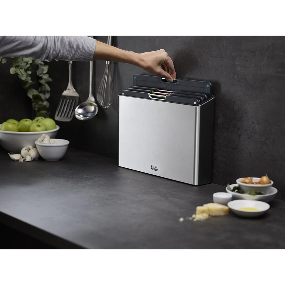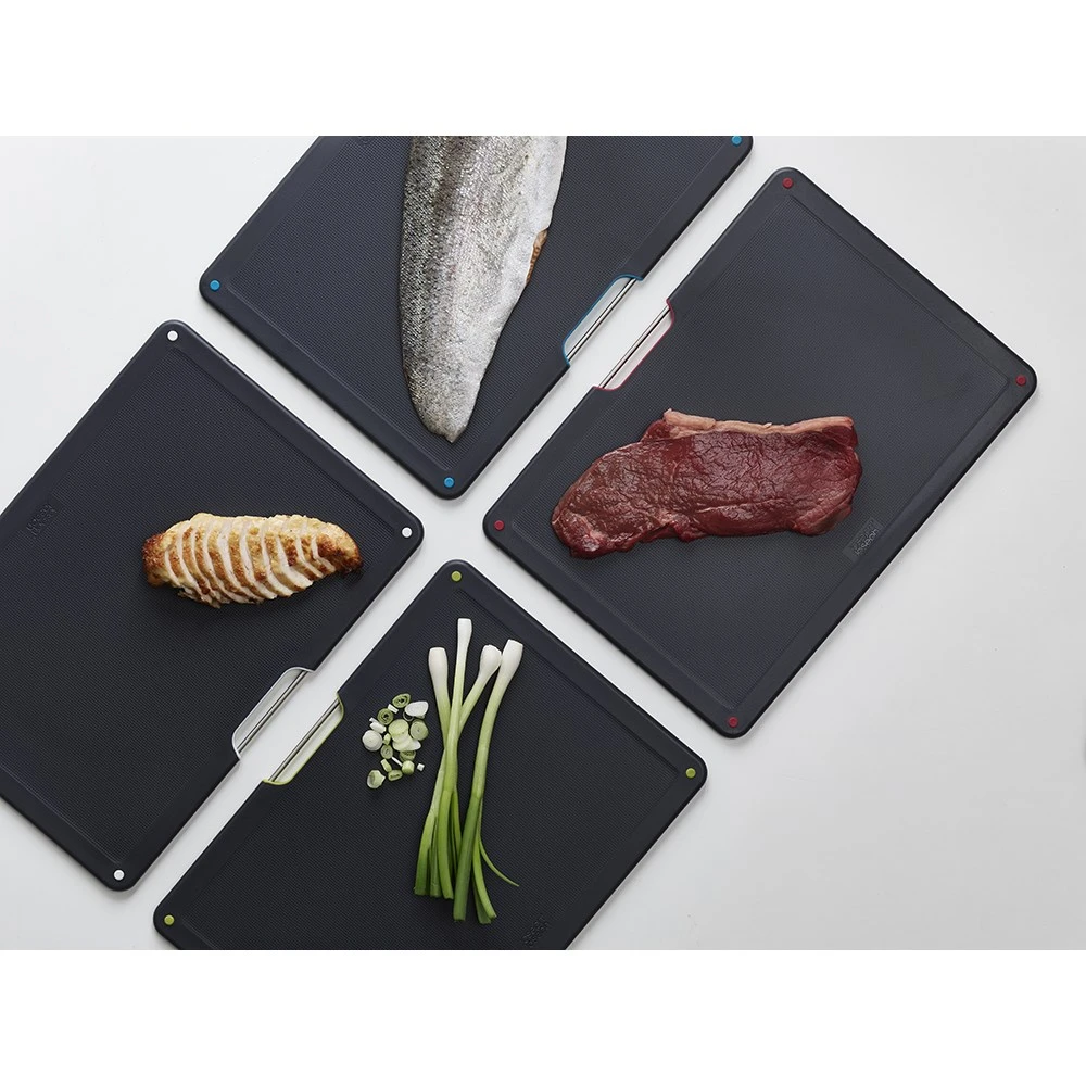 Prepare your meals in style with the beautifully designed Joseph Joseph Folio Steel 4 Piece Choping Board Set Stainless Steel
