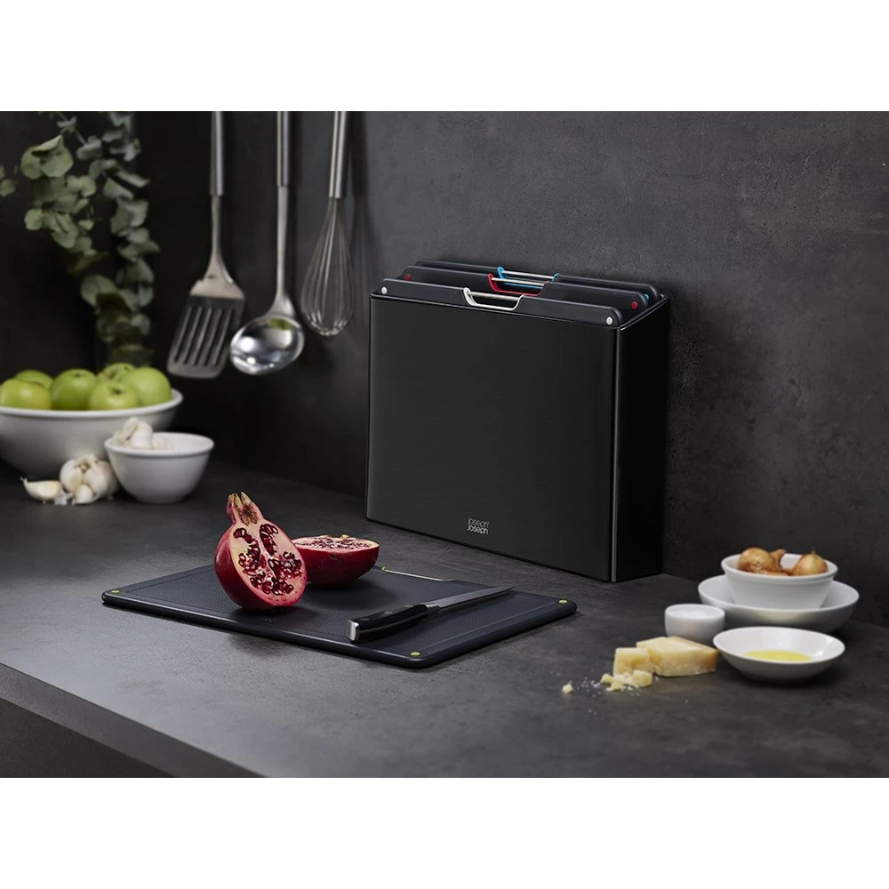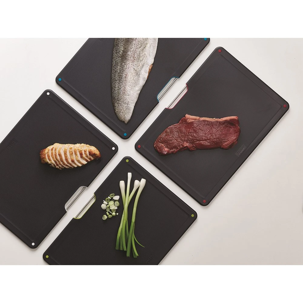 Prepare your meals in style with the beautifully designed Joseph Joseph Folio Steel 4 Piece Chopping Board Set Carbon Black