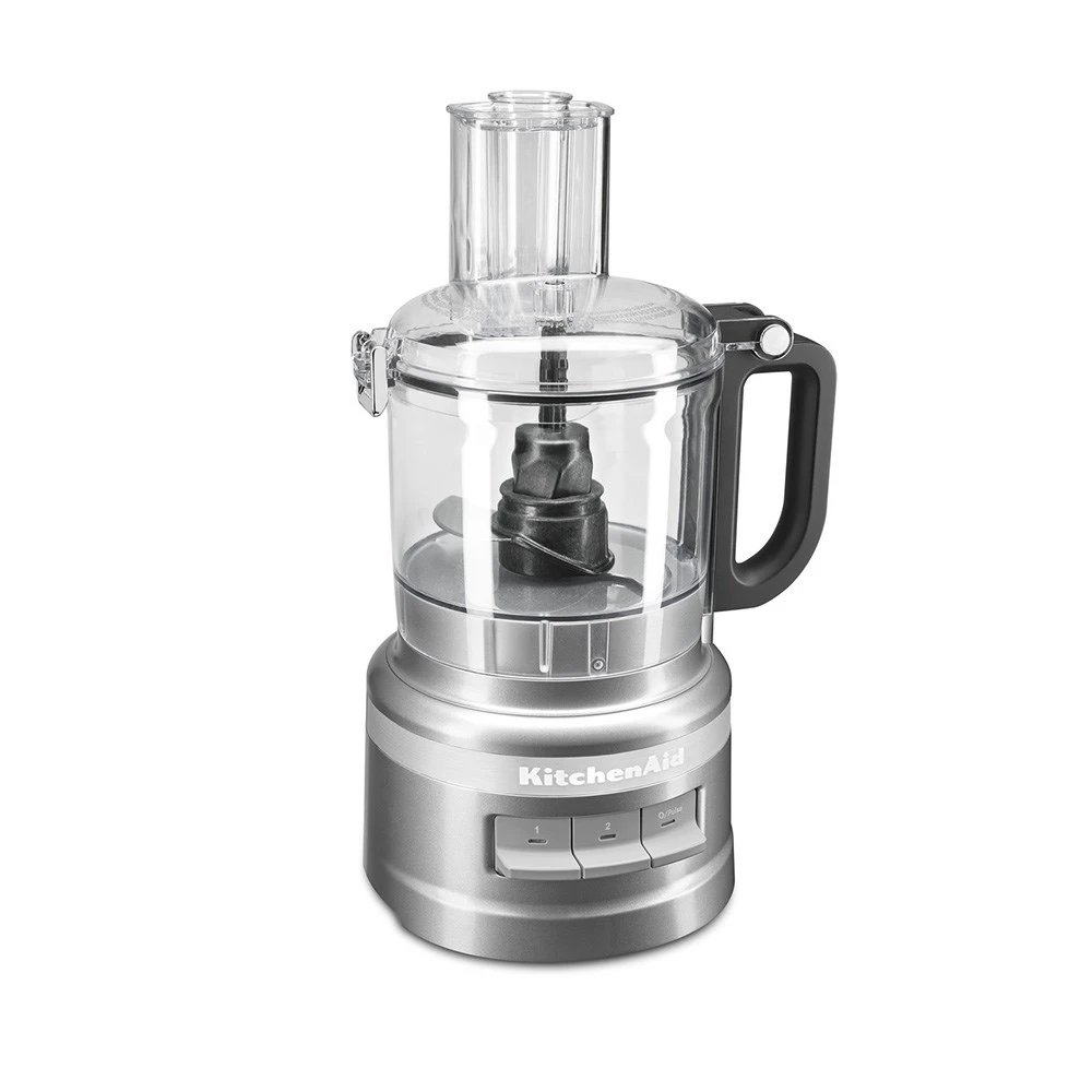 Bring versatility and style to your kitchen with the KitchenAid 7 Cup Food Processor! This highly functional food processor features multiple processing options so you can quickly and easily create delicious recipes at home. This food processor comes complete with a multi-purpose blade, a reversible shred disc, a dough blade, and a thick slicing disk for effortless chopping, slicing, pureeing and kneading. Offering low, high and pulse speed settings, the KitchenAid 7 Cup Food Processor is the perfect appliance for preparing all types of ingredients. Compact in design, the KitchenAid 7 Cup Food Processor boasts a sophisticated Contour Silver body that looks luxuriously stylish in any kitchen. Explore your passion for food and get creative in the kitchen with the KitchenAid 7 Cup Food Processor!