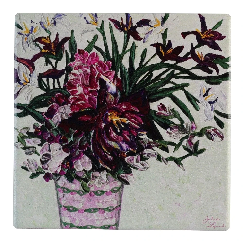 Combine beauty and practicality with the gorgeous Lilli Rock Orianna Trivet, crafted to protect your kitchen counters while busy preparing delicious meals. Acting as a barrier between piping hot pots, pans and dishes and the surface below, the Lilli Rock Orianna Trivet offers protection up to 220 degrees Celsius. Crafted from quality dolomite stone and backed with a soft cork layer, it also protects against liquids, scuffs and scratches. Graced with stunning artwork by Australian artist Julie Lynch, the trivet features an intricately hand-painted pot of florals in a selection of rich pink and purple hues. Easy to keep clean with a damp cloth, this trivet will gracefully transition from kitchen to tabletop to add a touch of elegance to every meal. Pair the Lilli Rock Orianna Trivet with the matching Orianna Set of 4 Coasters for a chic, coordinated tabletop.