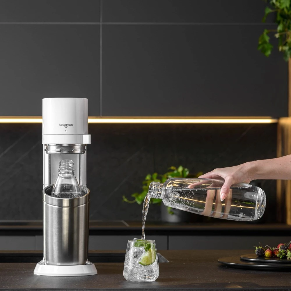 The SodaStream Duo Sparkling Water Maker is the most advanced way to sparkle your water. Create high-quality sparkling water at your convenience from home, with an environmentally friendly alternative to purchasing single bottles of sparkling water. Constructed from stainless steel and high-quality materials for durability, the Duo boasts a modern, premium aesthetic to compliment any kitchen décor. With its streamlined and compact design, the Duo fits under any kitchen cupboard. Time is no issue with a Quick Connect C02 cylinder for fast, one click cylinder insertion, turning tap water into Sparkling Water in seconds. This set also includes two dishwasher safe bottles and one C02 cylinder, creating up to 60L of sparkling water per cylinder.