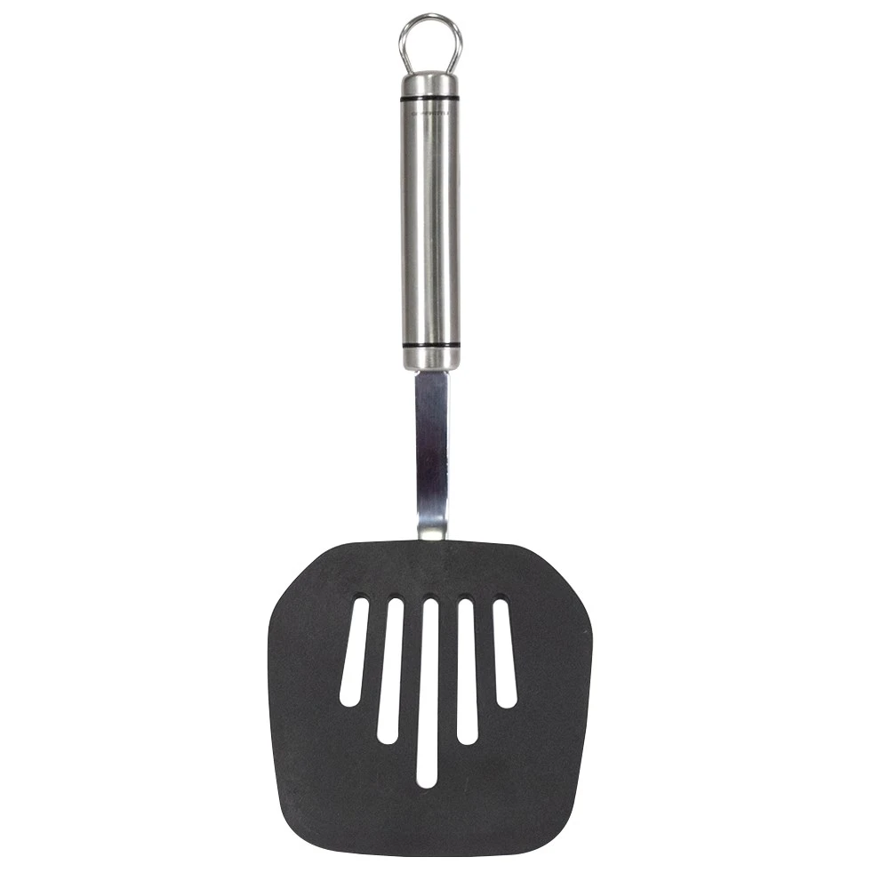 Both functional and practical, the Soffritto A Series Nylon Pancake Turner assures ultimate performance in the kitchen. This utensil is designed to craft your weekend pancakes with ease, with specially moulded slots to deter sticking from your batter mix. A high quality 18/10 stainless steel frame is built to last through the years, without compromising on feel. The well balanced handle features a loop for hanging, ensuring convenient and neat storage in your kitchen. The Soffritto A Series Nylon Pancake Turner is a part of the Soffritto A Series range, meaning it is designed and engineered to the highest professional standards. With their modern and sophisticated black trim, each product in the A Series range is designed to emulate the precision tools of professional chefs, no matter where and when you cook.