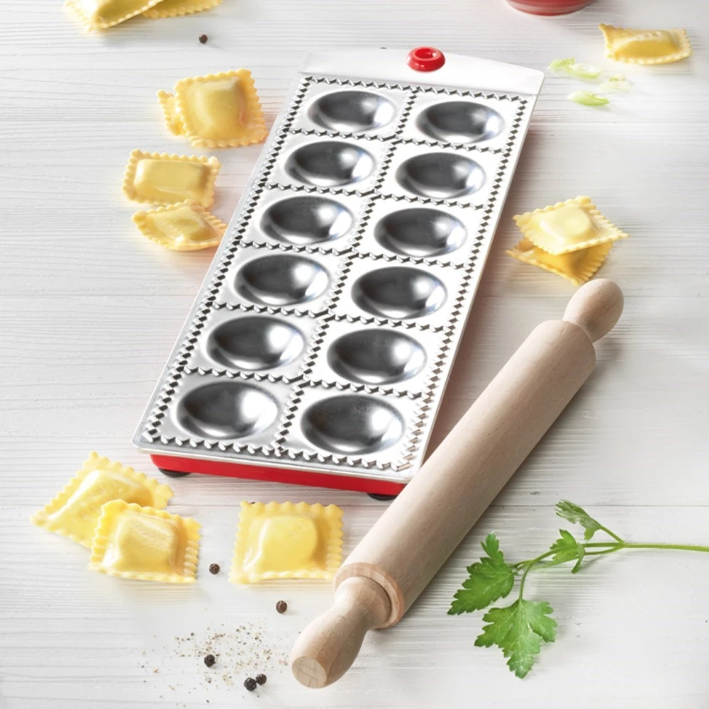 Create your own ravioli from the comfort of your own home with the Soffritto Ravioli Tray and Rolling Pin Set.